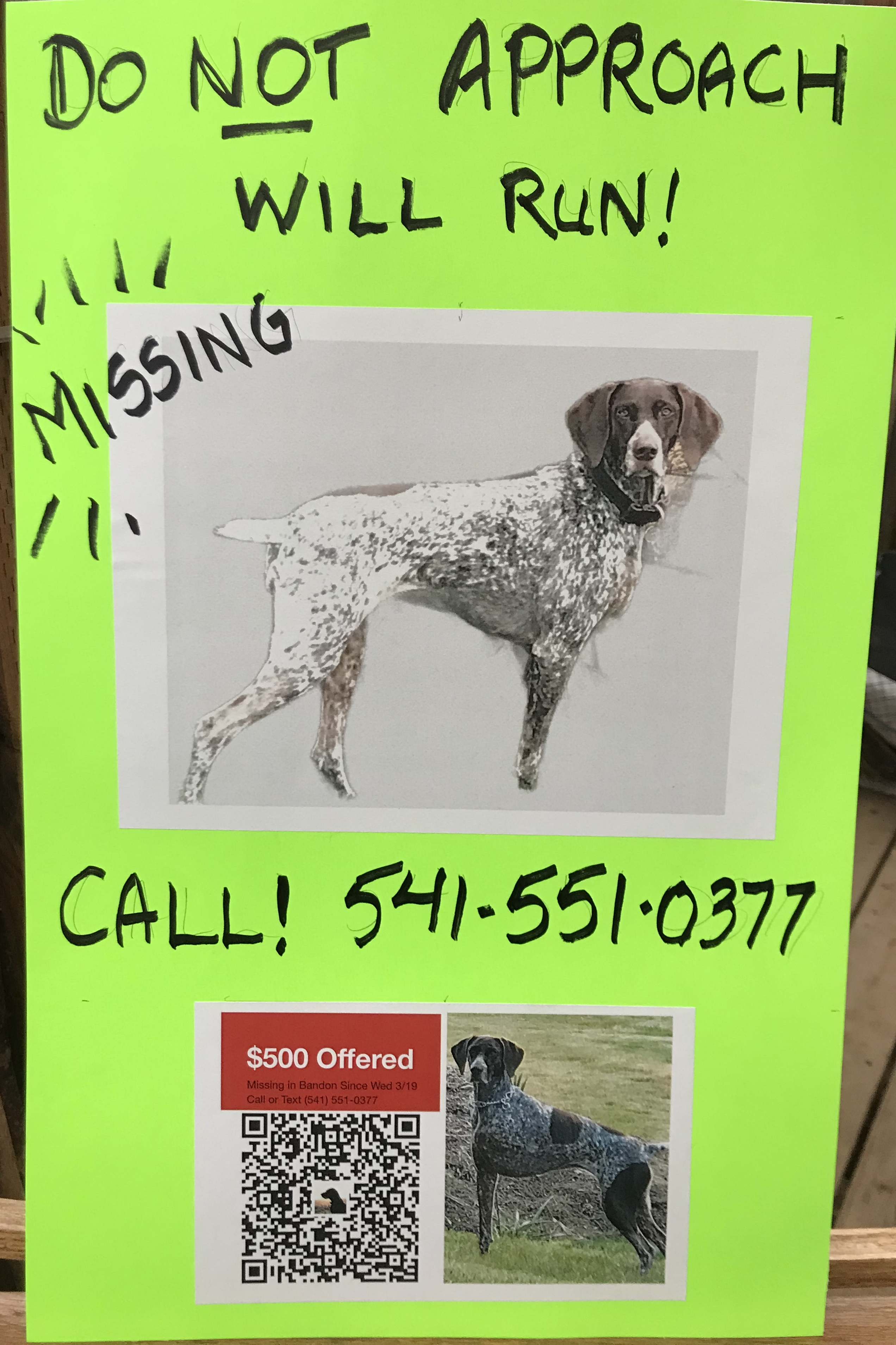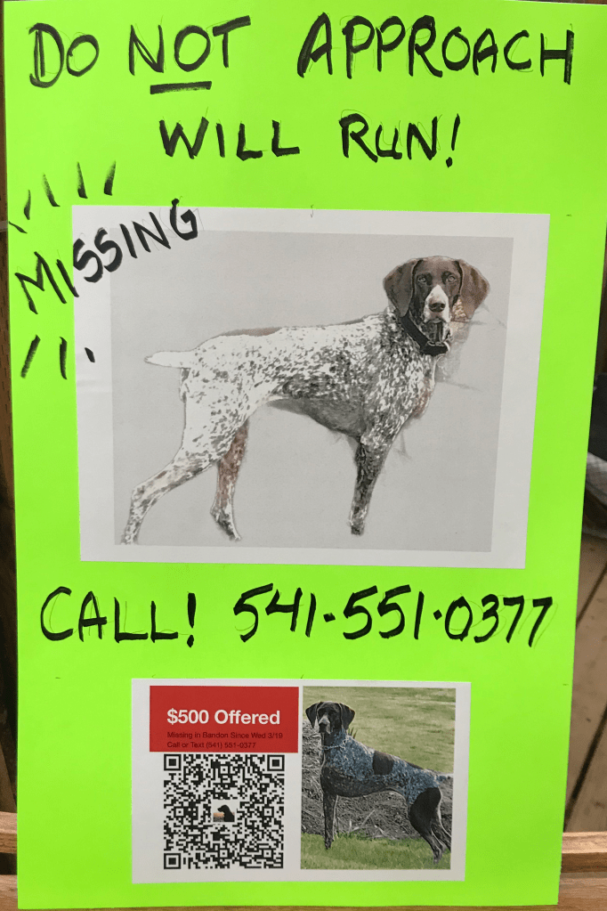 We ask our Bandon neighbors to survey their property. Quietly, peek in places a frightened dog might hide. Call immediately if you see her.