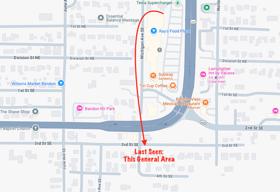 She was last pursued by other parties near Michigan and 3rd Street just south of Hwy 101 … more or less across the highway between Coast Community Health and Bandon Veterinary.
